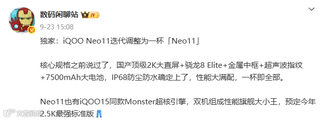 另据博主@数码闲聊站 的爆料显示,iQOO Neo11搭载“国产顶级2K大直屏+骁龙8 Elite处理器+金属中框+超声波指纹+7500mAh大电池+IP68防尘防水,“性能大满配,一杯即全部”,还有iQOO15同款Monster超核引擎,双机组成性能旗舰大小王,“预定今年2.5K最强标准版”。