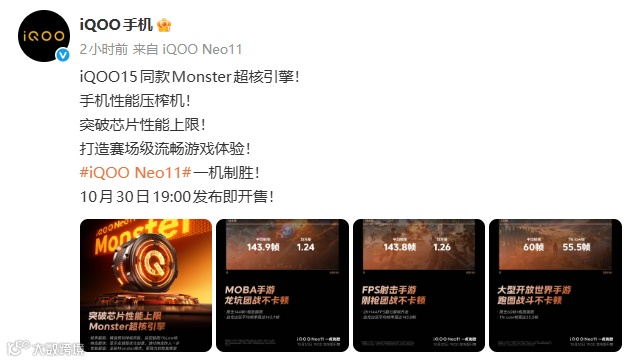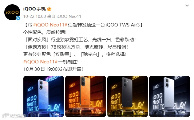 ,iQOO Neo11将于10月30日19:00发布即开售。