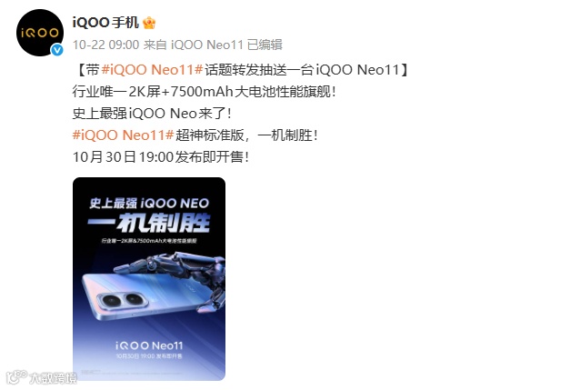 导读:近日,iQOO手机官方宣布,iQOO Neo11将于10月30日19:00发布即开售。