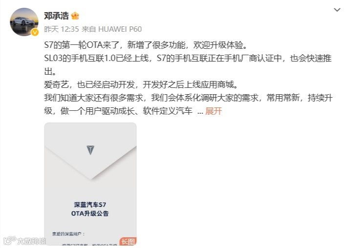 日前,深蓝汽车CEO邓承浩发文宣布了深蓝S7获得第一轮OTA升级。其表示,此次升级新增了很多功能。同时,此前已于深蓝SL03上线的手机互联也将登陆深蓝S7,目前正处于手机厂商认证阶段。另外,爱奇艺也已经启动开发,后续会上线应用商场。