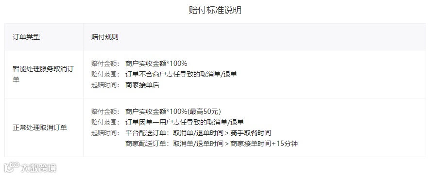 赔付金=商家实收金额*100%(订单因顾客原因导致取消/退款,单笔订单最高赔付50元)