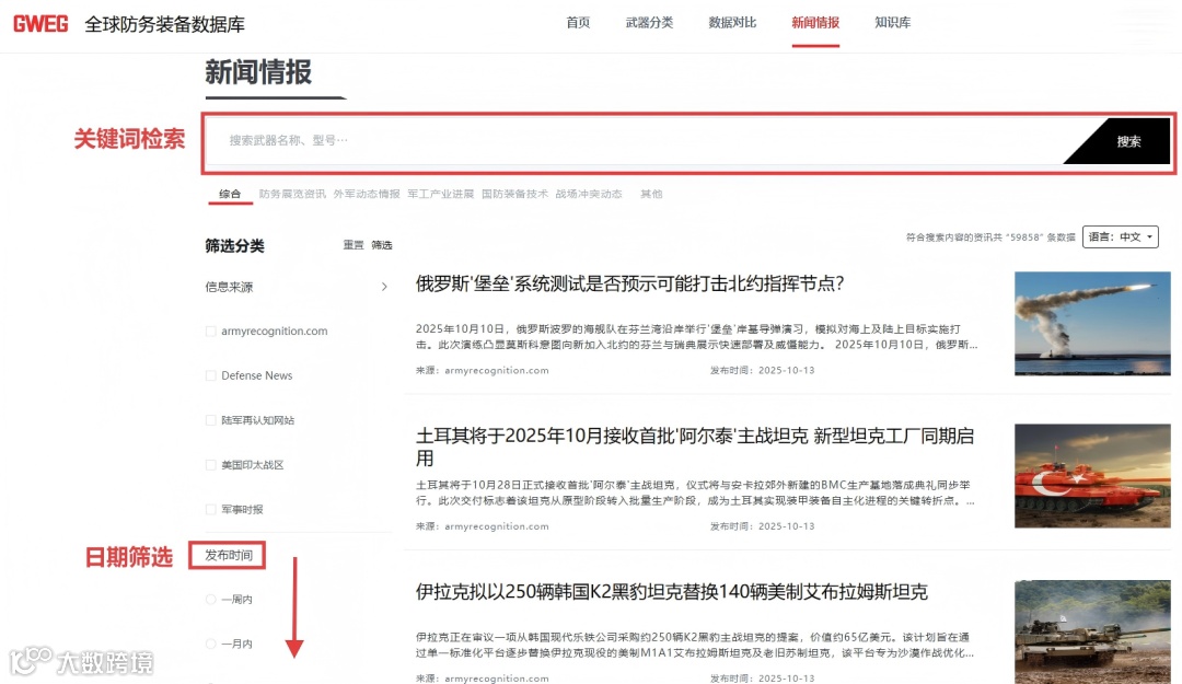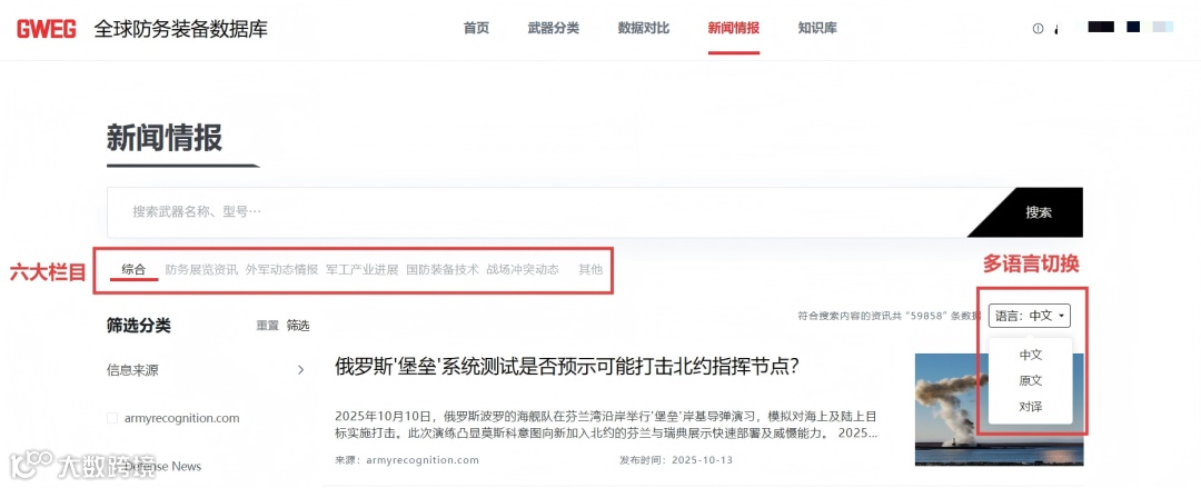 如今,全球防务装备数据库(GWEG)全新升级「新闻情报」模块,以更权威的资讯、更即时的更新、更全面的覆盖,为您提供坚实的信息支撑,助力科学研判与精准决策!
