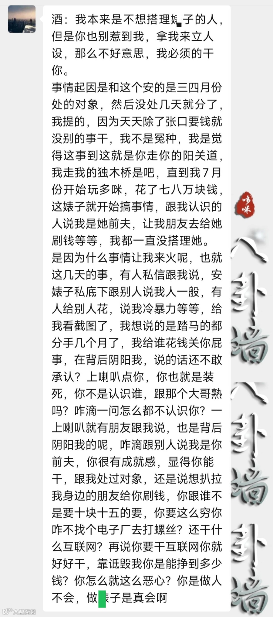 真正让我忍无可忍、必须站出来说清楚的,就是这几天发生的事!有朋友特意私信我,给我发了一堆截图,截图里“安”在私底下跟别人嚼舌根,把我说得一文不值——一会儿说我人品一般,一会儿说我对别人出手大方就对她不好,甚至还捏造我对她实施冷暴力的谣言!我真是越看越气,真想当面问问她:我们都分手好几个月了,我愿意给谁花钱、花多少钱,那是我的自由,跟你有半毛钱关系吗?用得着你在背后说三道四?