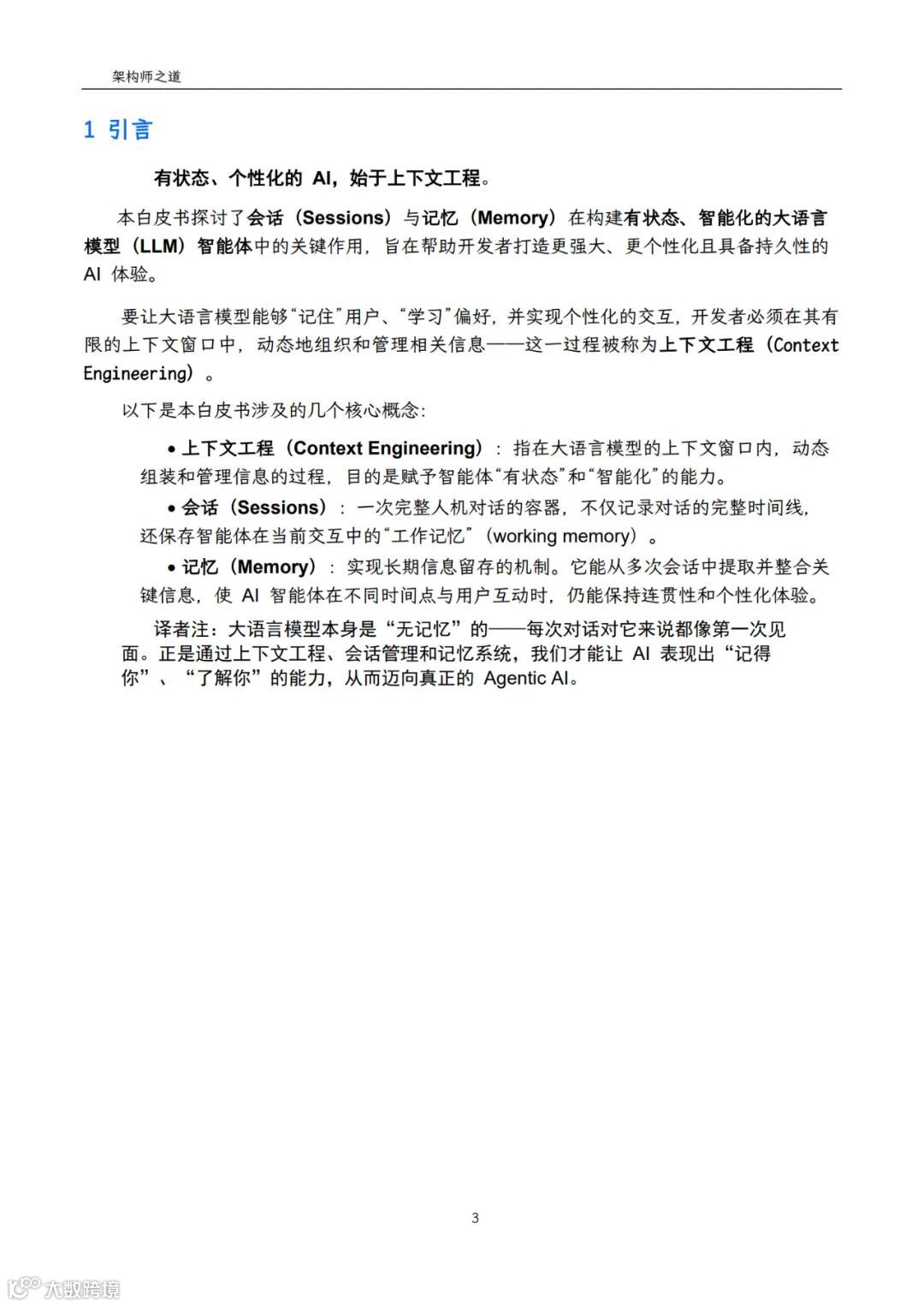 导读:本白皮书探讨了会话(Sessions)与记忆(Memory)在构建有状态、智能化的大语言 模型(LLM)智能体