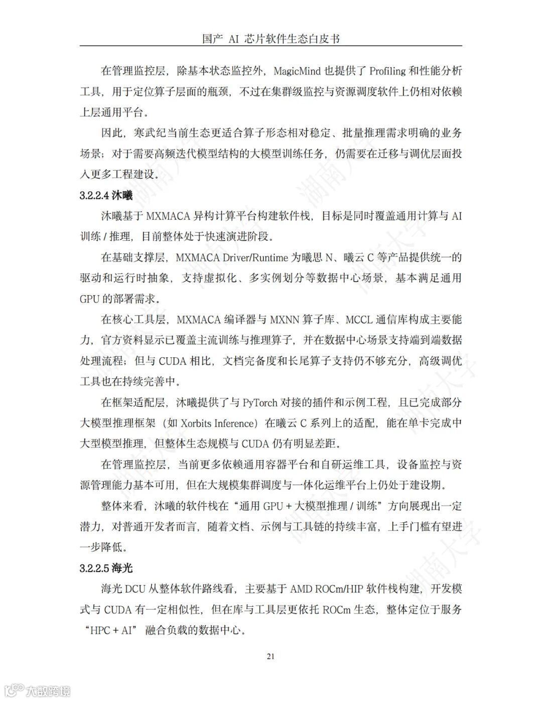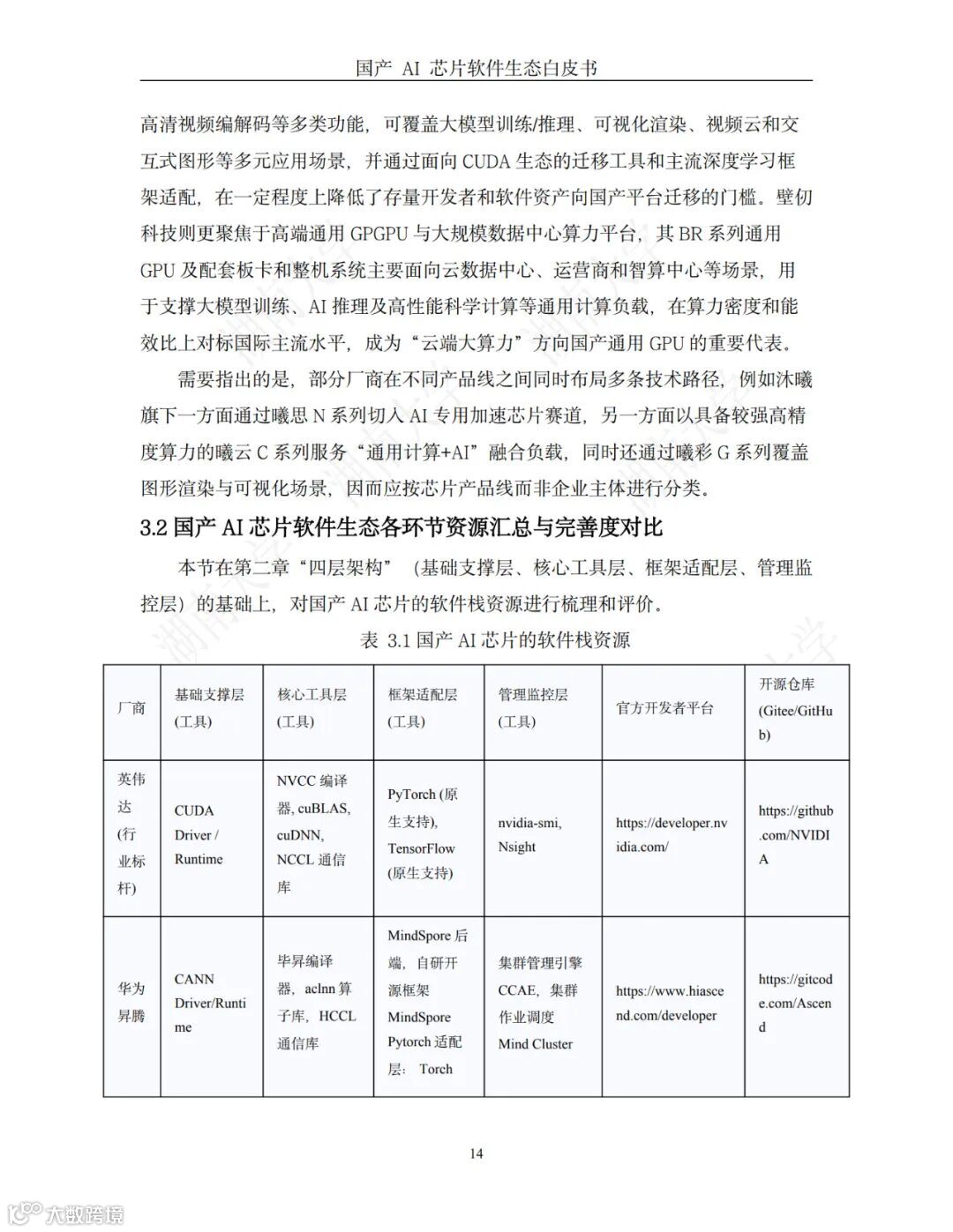 在科技竞争日益激烈的国际大背景下,以构建自主可控的 AI 芯片及其软件生 态战略为指引,我国 AI 芯片近些年在技术创新与市场拓展方面均收获颇丰。以华 为昇腾、寒武纪、地平线、沐曦、燧原科技、海光信息、壁仞科技、摩尔线程及天 数智芯等为代表的一批本土企业,已成功推出一系列具有市场竞争力的 AI 芯片产 品,在国内市场形成了多厂商、多技术路线并行的活跃竞争格局。 随着国产 AI 芯片在算力、能效比等硬件指标上的突破,用户关注点已从“有 没有”转向“好不好”——即软件生态的成熟度、兼容性与易用性。这里的“好不 好”,其核心指向的已不再仅仅是芯片的理论峰值性能,而是其背后支撑的软件生 态是否成熟、完善与开放。 一个成熟的软件生态,是决定芯片价值能否充分释放的关键。它体现在很多方 面,包括基础软件栈的完备性与稳定性、算子库的丰富度与高性能实现、编译工具 链的智能化与高效性、以及对 PyTorch 等业界主流 AI 框架的无缝兼容与深度适配 能力、开发社区的活跃度等。对于广大的 AI 开发者和企业用户而言,一个完善的 软件生态意味着其现有的 AI 应用、算法模型与开发工作流,能够以极低的迁移成 本、甚至实现“无感”地部署到新的国产硬件平台上,从而避免大规模的代码重构 和漫长的适配调试周期。因此,软件生态的构建水平,不仅是衡量国产 AI 芯片核 心竞争力的关键标尺,更直接决定了其商业化落地的广度、深度以及最终能否赢得 用户信任与市场份额。本白皮书的核心目的在于系统性地梳理和评估国产 AI 芯片软件生态的发展现 状,为产业界、学术界及政府部门提供一份客观的技术参考与决策依据。AI 芯片 软件生态主要由"四层架构"组成,包括基础支撑层、核心工具层、框架适配层与管 理监控层,各模块通过"技术依赖-功能协同"形成闭环,共同作用于 AI 模型的训练 与推理过程。然而,不同厂商在生态建设上呈现出显著差异:例如,华为昇腾通过自研软件栈,构建出一套完整的自主软件生态体系;摩尔线程通过高度对标NVIDIA CUDA 生态,实现了极高的兼容性。 本白皮书的意义体现在三个层面:(1)深度剖析 AI 芯片软件生态,形成系 统性介绍。将 AI 芯片软件生态分为"四层架构",包括基础支撑层、核心工具层、 框架适配层与管理监控层,剖析其概念与作用,介绍具体案例。(2)汇总国产AI 芯片软件生态资源,形成资源指南。详细调研多款代表性国产 AI 芯片,汇总 介绍其软件生态并给出资源链接,帮助企业和开发者根据自身应用场景(如训练、 推理、边缘计算等)和技术栈基础,选择最适合的解决方案,避免盲目追求"算力 峰值"而忽视生态兼容性的误区。(3)为政策制定提供参考。通过客观评估国产软 件生态,为相关产业政策的制定提供数据支撑,助力我国 AI 芯片产业实现从"基 础可用"向"场景好用"的关键跨越。 免费下载白皮书,点击并搜索→:芯片软件
