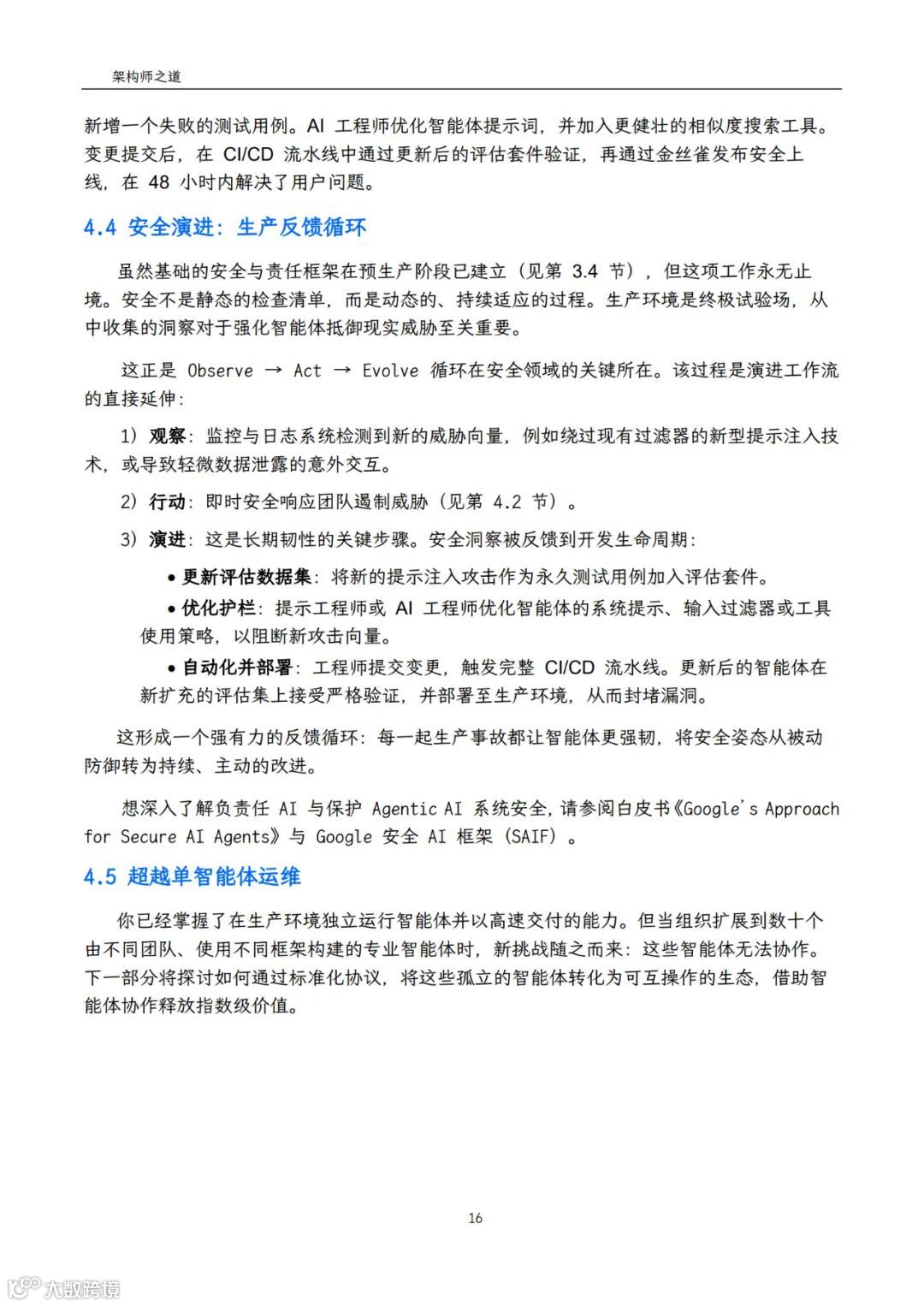 本白皮书是你逐步搭建这一基础并穿越生产落地之路的行动手册!我们将从投产前的关键 准备讲起,展示如何搭建自动化 CI/CD 流水线,并将严格评估作为关键质量关卡。随后深入 智能体在真实环境中运行的挑战,涵盖扩展、性能调优与实时监控策略。最后,我们将展望多 智能体系统的广阔前景,借助 Agent-to-Agent 协议,探讨实现安全高效通信所需的要素。
