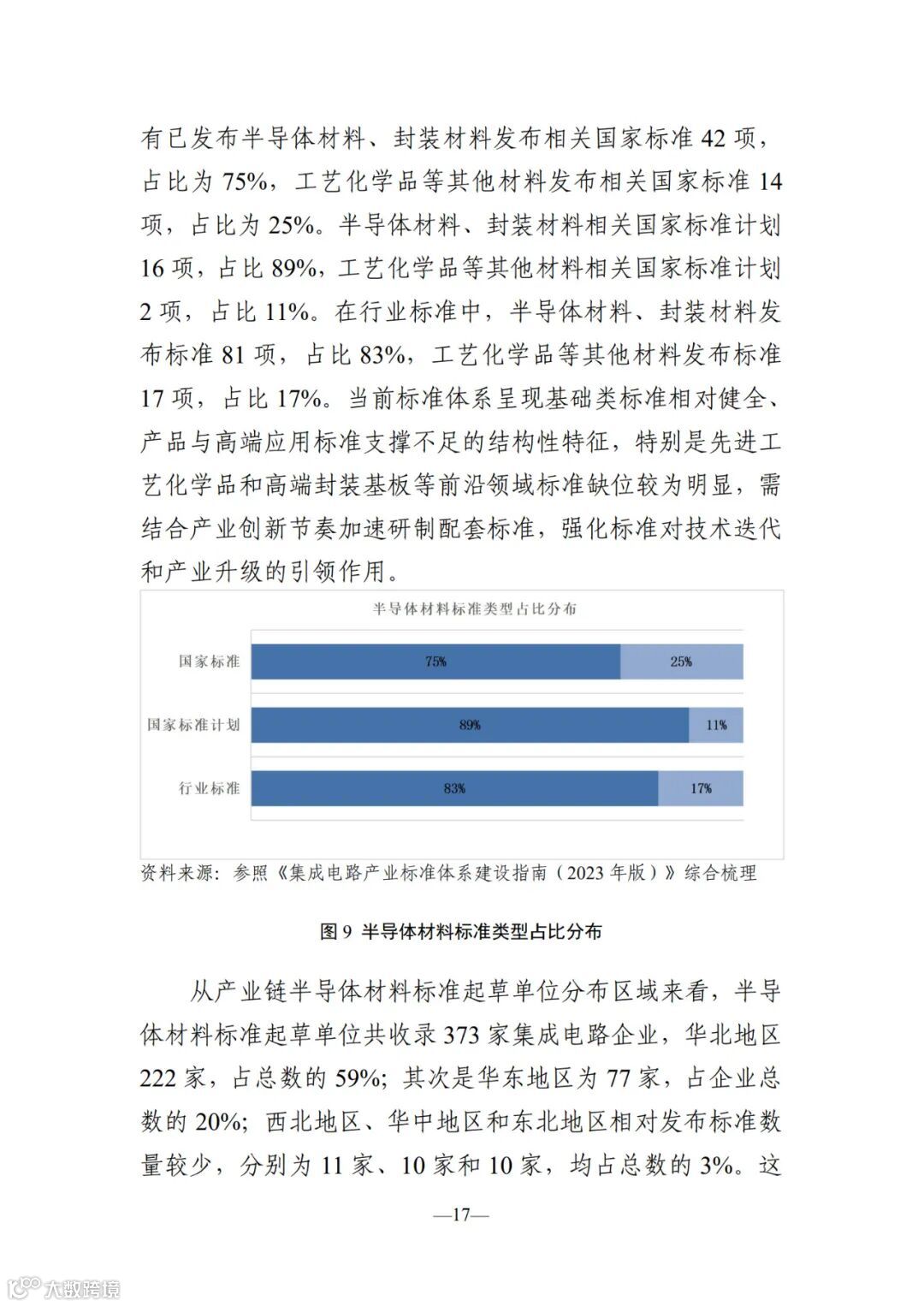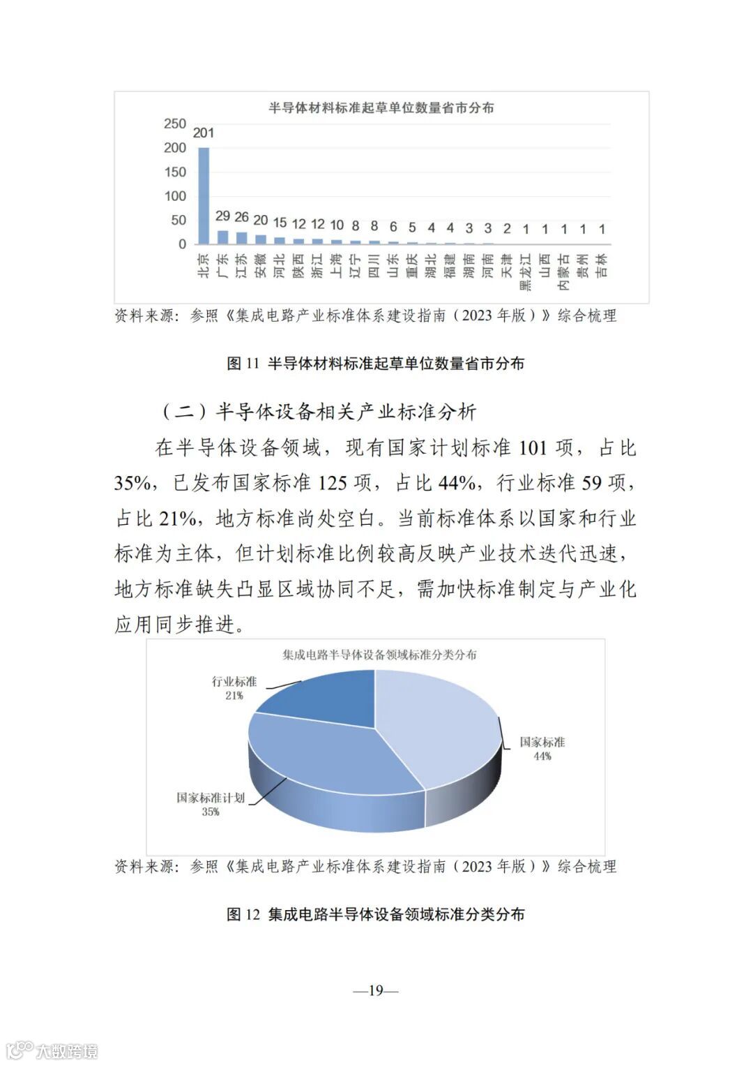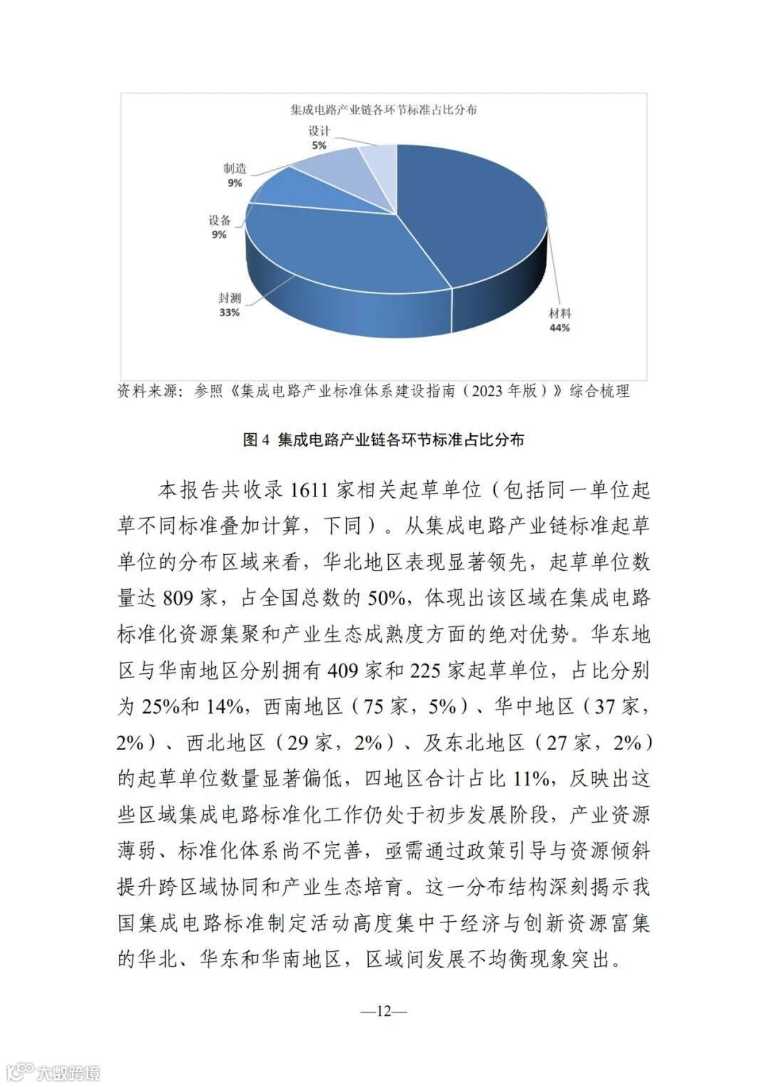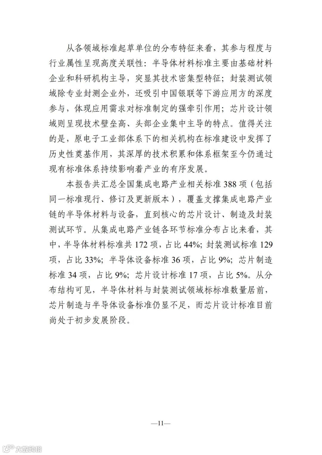 本报 告聚焦半导体材料、设备及芯片设计、制造、封装测试等关 键环节,全面梳理现行国家标准、行业标准、地方标准及国 家标准在研计划,深入分析标准类型与产业环节的匹配关 系,并解析起草单位的区域分布特征。
