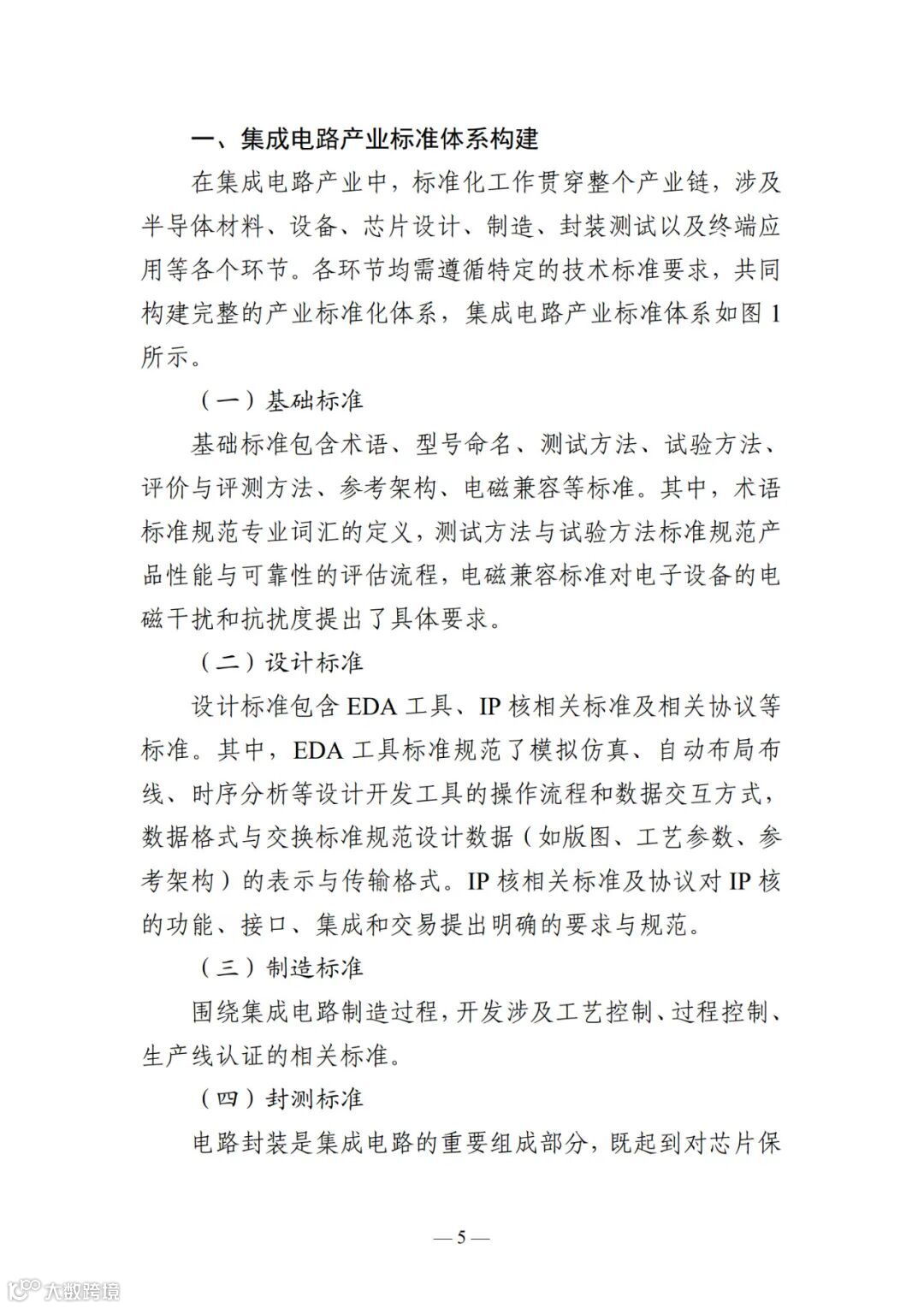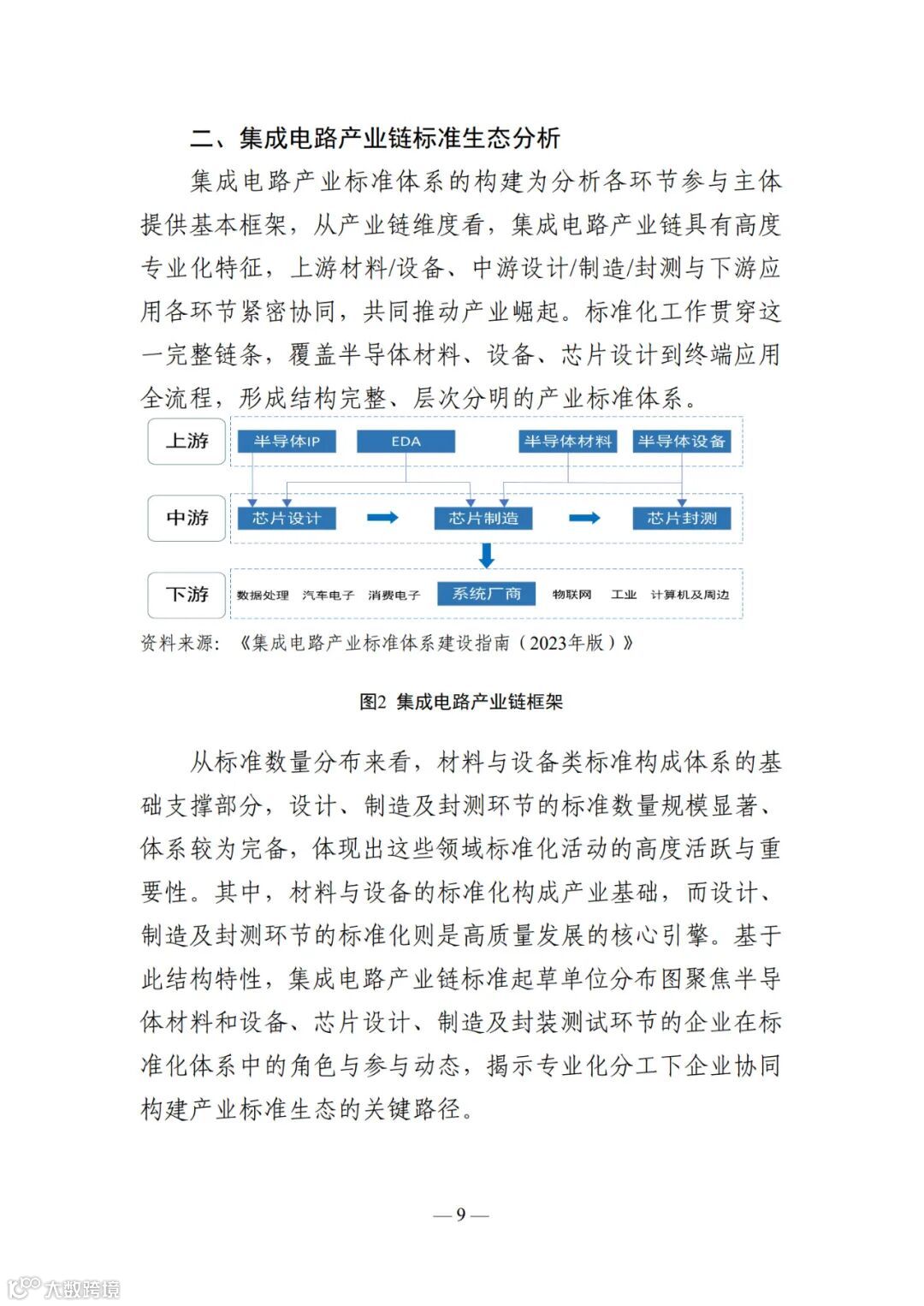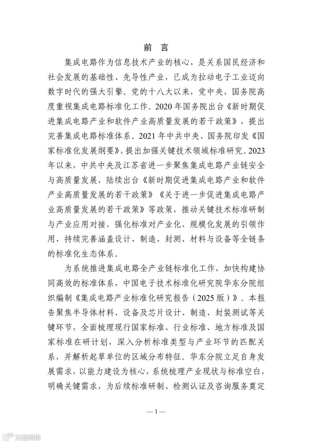 年以来,中共中央及江苏省进一步聚焦集成电路产业链安全 与高质量发展,陆续出台《新时期促进集成电路产业和软件 产业高质量发展的若干政策》《关于进一步促进集成电路产 业高质量发展的若干政策》等政策,推动关键技术标准研制 与产业应用对接,强化标准对产业化、规模化发展的引领作 用,持续完善涵盖设计、制造、封测、材料与设备等全链条 的标准化生态体系。 为系统推进集成电路全产业链标准化工作,加快构建协 同高效的标准体系,中国电子技术标准化研究院华东分院组 织编制《集成电路产业标准化研究报告(