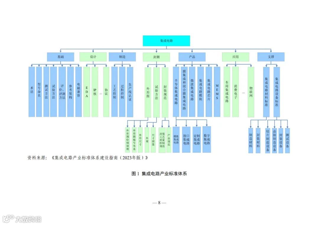 在集成电路产业中,标准化工作贯穿整个产业链,涉及 半导体材料、设备、芯片设计、制造、封装测试以及终端应 用等各个环节。各环节均需遵循特定的技术标准要求,共同 构建完整的产业标准化体系,集成电路产业标准体系如图