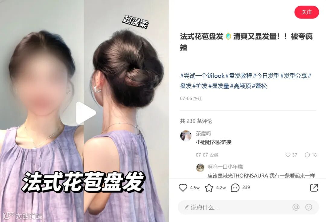博主正面和背面图展示+大头图+“法式花苞盘发”精准场景词汇,效果直观,定位准确,击中痛点。