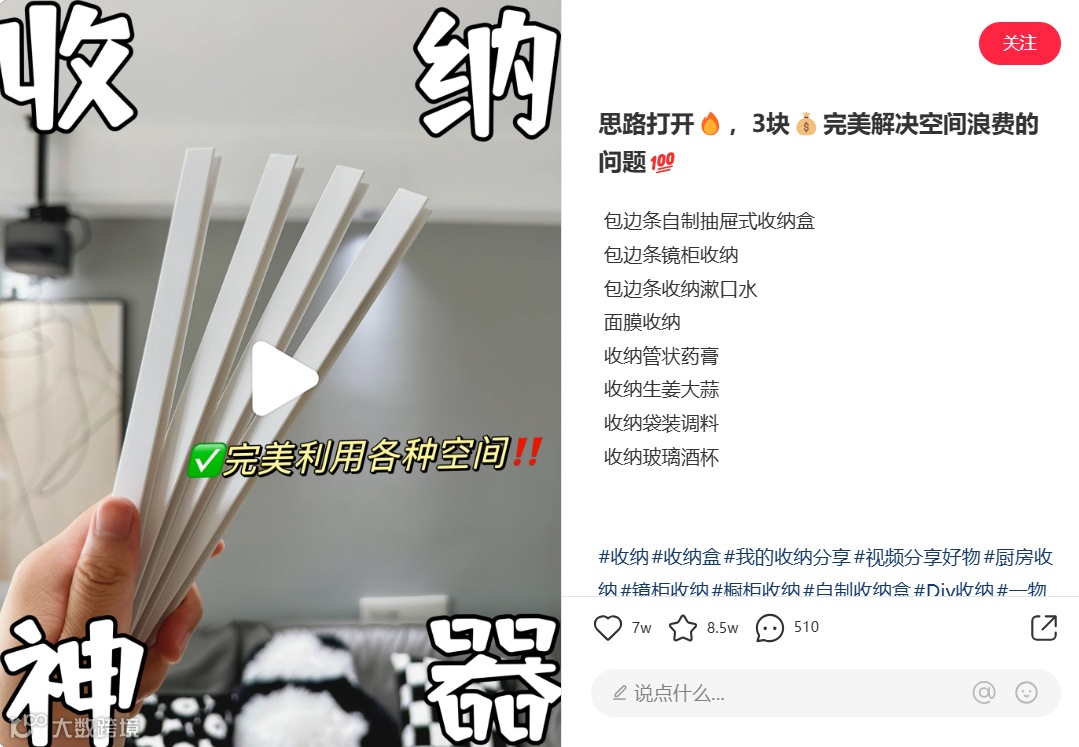 家居家装品牌在做产品测评or使用教程时,不妨采用“一物多用”的视角讲解,在剪辑方式上可采用前后对比式,更利于展示产品的好用性,种草效果佳。