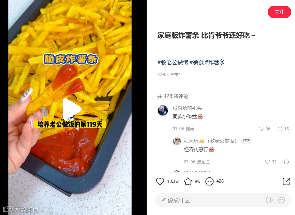 封面:“培养老公做饭的第119天”,系列性文案吸引人看完视频还想看同系列其他的,诱人的薯条沾上番茄酱特写,让人食欲大增。