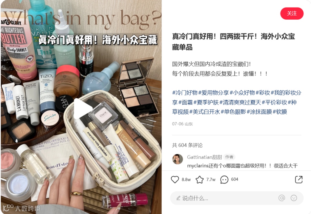 标题采用“情绪词+效果+解决方式”的形式,“真冷门好用”对比词圈定效果,“海外小众宝藏单品”圈定产品来源,“四两拨千斤”数字+效果,给人想一看究竟的感觉。