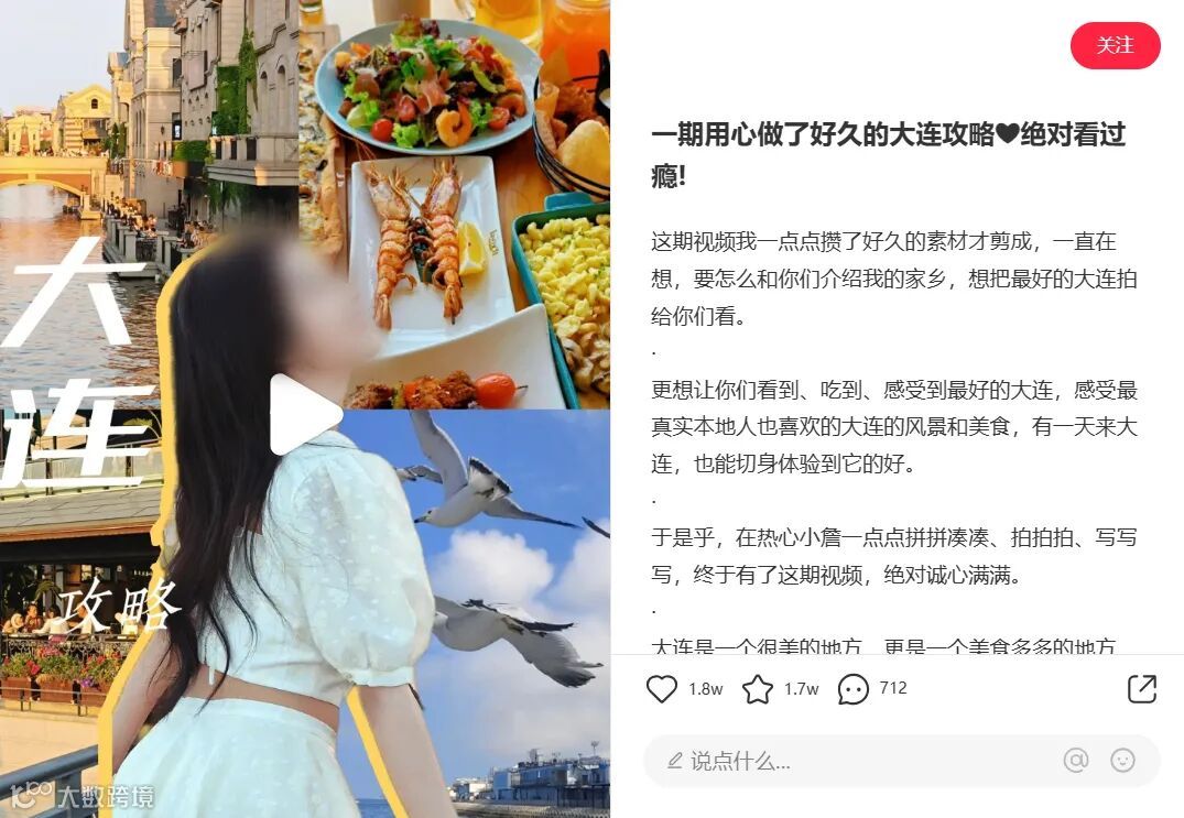 视频内容采用第一视角实地拍摄+画外音的同步解说,结合场景,手把手教你如何玩转大连,是一篇很好的教程视频,自然收藏点赞量不会差。