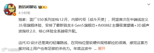 博主@数码闲聊站 今日的一份爆料中提到,vivo S50系列定档12月,内部代号“战斗天使”,vivo首次在中端线定义3S级旗舰体验,安排了最新骁龙8 Gen5旗舰芯+IMX882主摄级潜望镜+3D超声波指纹2.0,核心体验全系越级升配。