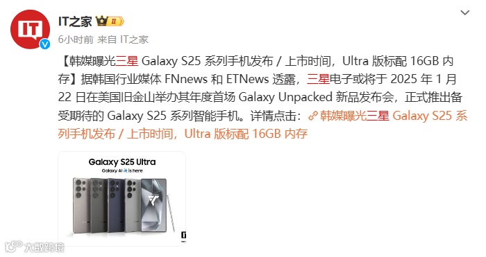 曝三星Galaxy S25系列明年1月22日发布,Ultra版标配16G内存