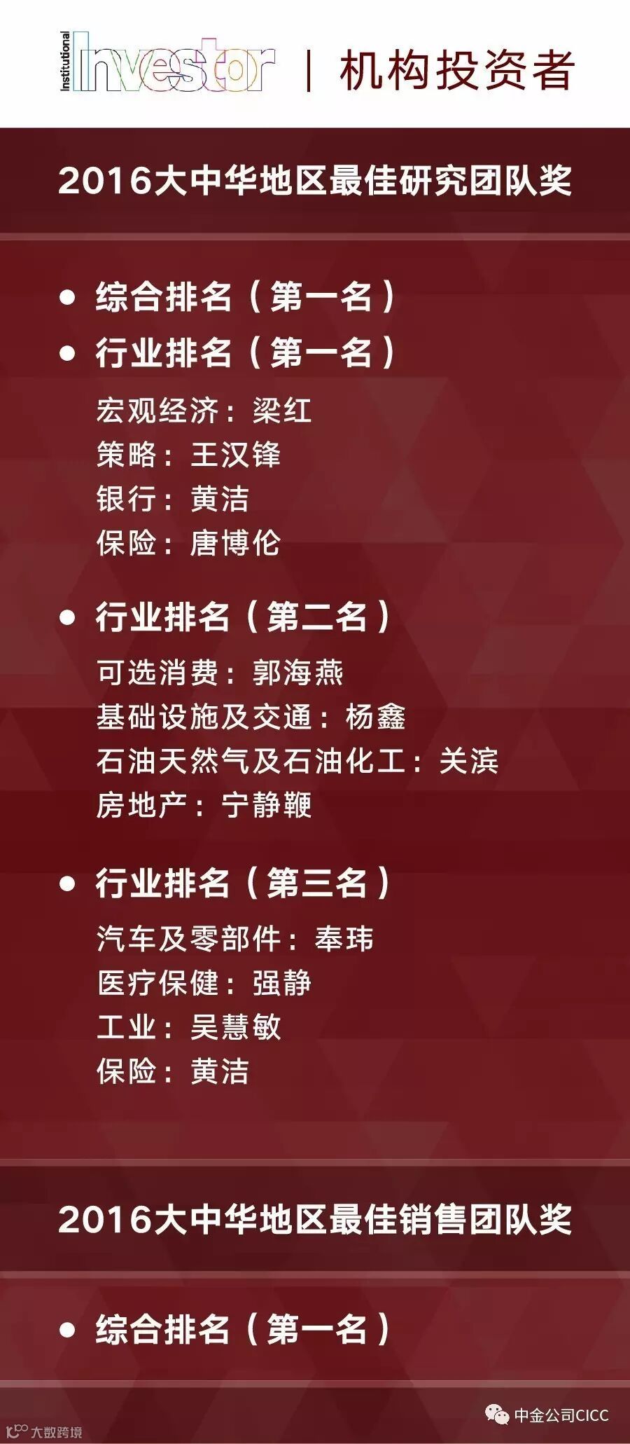 《机构投资者》于日前公布了2016年度评选结果,中金凭借突出的专业实力再次从激烈的评选中脱颖而出,摘取多项大奖。其中,中金连续第五年同时荣获“大中华地区最佳研究团队”综合排名第一和“大中华地区最佳销售团队” 综合排名第一(2012-2016)。此外,中金分析师还荣获多项行业排名殊荣。所获奖项一览如下:
