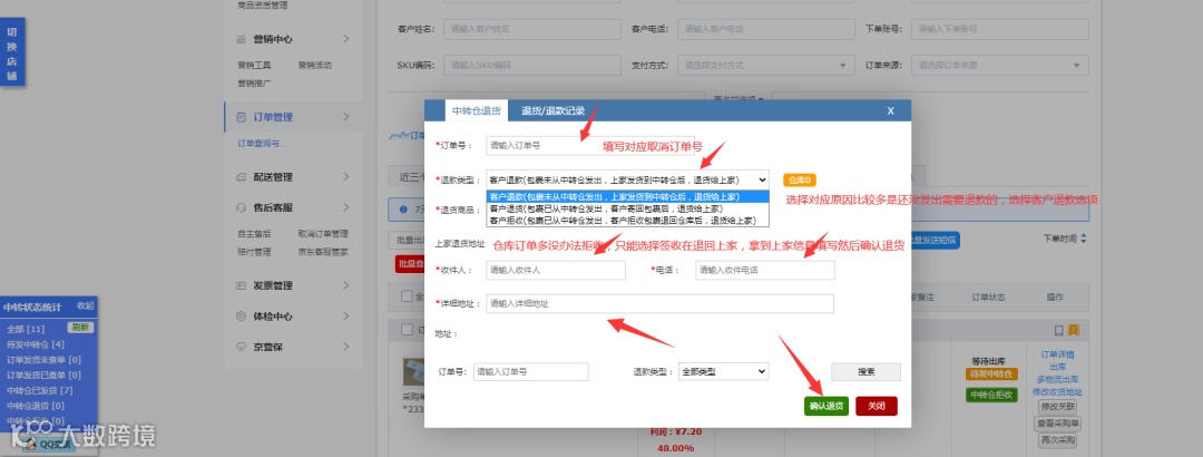 1)中转仓收到产品还没发出前,要先点击中转仓拒收(重要提醒:点击拒收是给到中转仓一个信号不要发出,如果不点会发到客户地址),点击中转仓拒收确定后会变成取消拒收选项;