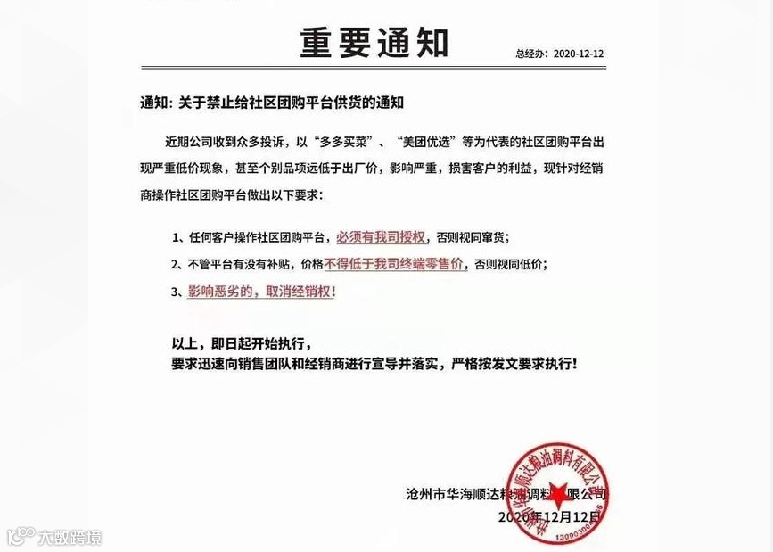 昨天,华海顺达和卫龙已经下发通知,禁止自家经销商将商品上架社区团购平台,因为这些平台低于出厂价,扰乱了市场。