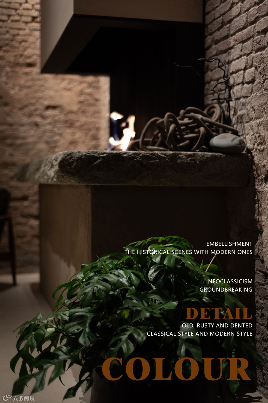 生锈的铁链与蓬勃的绿植形成对比,透露着马车房历史的冷酷和新空间的柔情。
