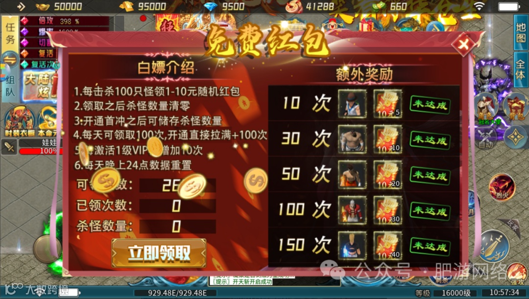 礼包内容:1000红包、100%爆率、一亿切割、张辽的化身时装、至尊金蟾王坐骑、你们过来呀称号