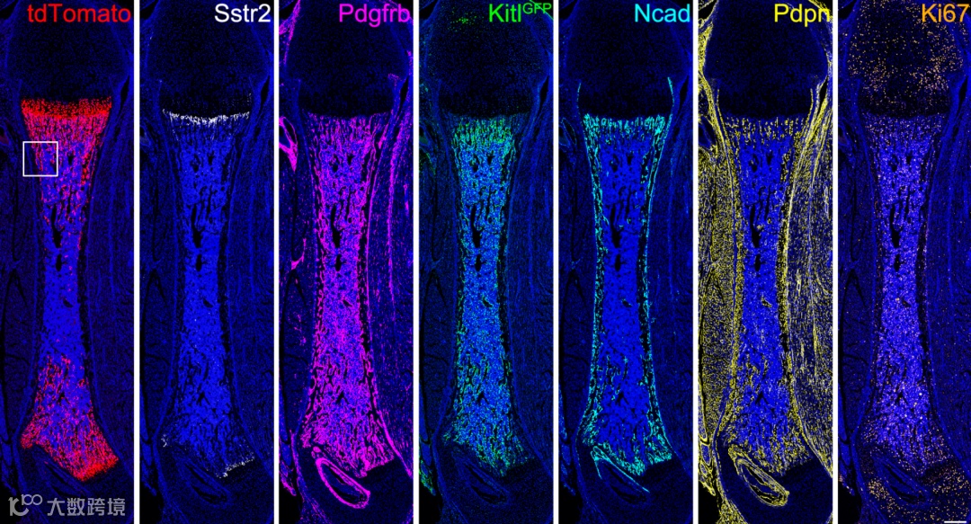 本研究中应用于多重免疫荧光标记的抗体及使用稀释比例:GFP(CST,2956,1:400),红色荧光蛋白(Rockland,600-401-379,1:800),Pdgfrb(CST,3169,1:400),Emcn(Thermo Fisher Scientific,14-5851-82,1:800),Sstr2(Abcam,ab134152,1:800),N-钙粘蛋白(Abcam,ab76011,1:500),Pdpn(Sino Biological,50256-R066,1:1000),CD200(Novusbio,BAF3355,1:400),CD51(Abcam,ab208012,1:400),Ly51(Sino Biological,50082-T24,1:1000),Thy1(Sino Biological,50461-T44,1:1000),CD105(Abcam,ab221675,1:400),CD31(CST,77699,1:400),CD45(CST,70257,1:400),Ter119(BioLegend,116201,1:1000),Ki67(CST,12202,1:400),Lepr(Novusbio,BAF497,1:200),Hgs(Abcam,ab155539,1:300),和Sox9(Abcam,ab185966,1:400)。