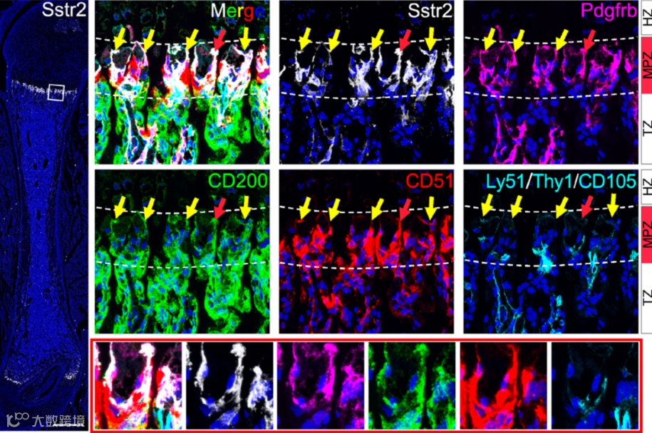 转基因小鼠模型:研究团队利用特定的转基因小鼠模型,如Col10a1-Cre;ROSA26LSL-ZsGreen,Ihh-Dre;Sstr2XER;ROSA26LSL-EYFP/RSR-tdTomato来标记和追踪肥大软骨细胞来源的干细胞群体。