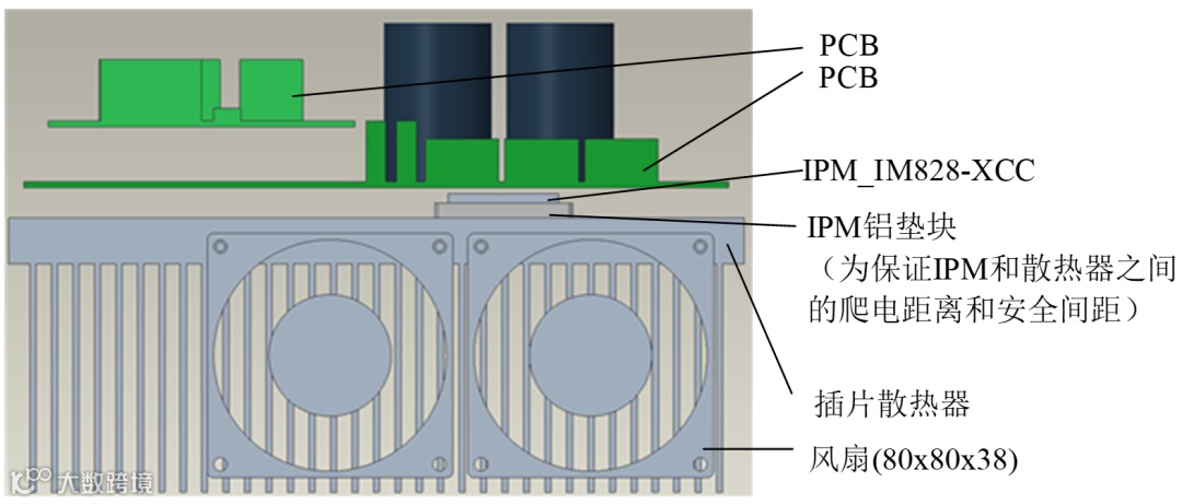 高速电机驱动控制器尺寸较小,功率较大,如何将热量快速散去也是整体设计的难点之一,根据图11所示得设计原理,考虑到IPM_IM828-XCC的位置,需要在IPM以及整流桥各加装垫块,IPM垫块是为了保证IPM和散热器之间的爬电间距和安全距离。