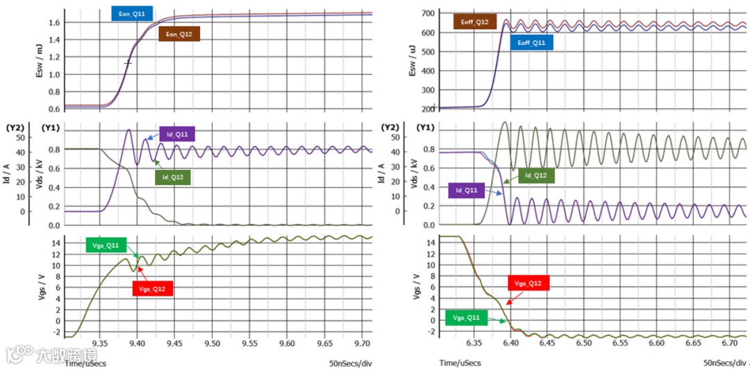 1、并联单管的源极电感Lex差异,SiC MOSFET的开通与关断的均流对此非常敏感。因为,源极电感的差异也会耦合影响到驱动回路,以进一步影响均流。如下图8所示,以关断为例,由于源极电感Lex不同,造成源极环流和源极的电位差(VQ11_EE-VQ12_EE),推高了Q11源极电压VQ11_EE,间接降低了Q11门级与源极之间的电压Vgs_Q11。