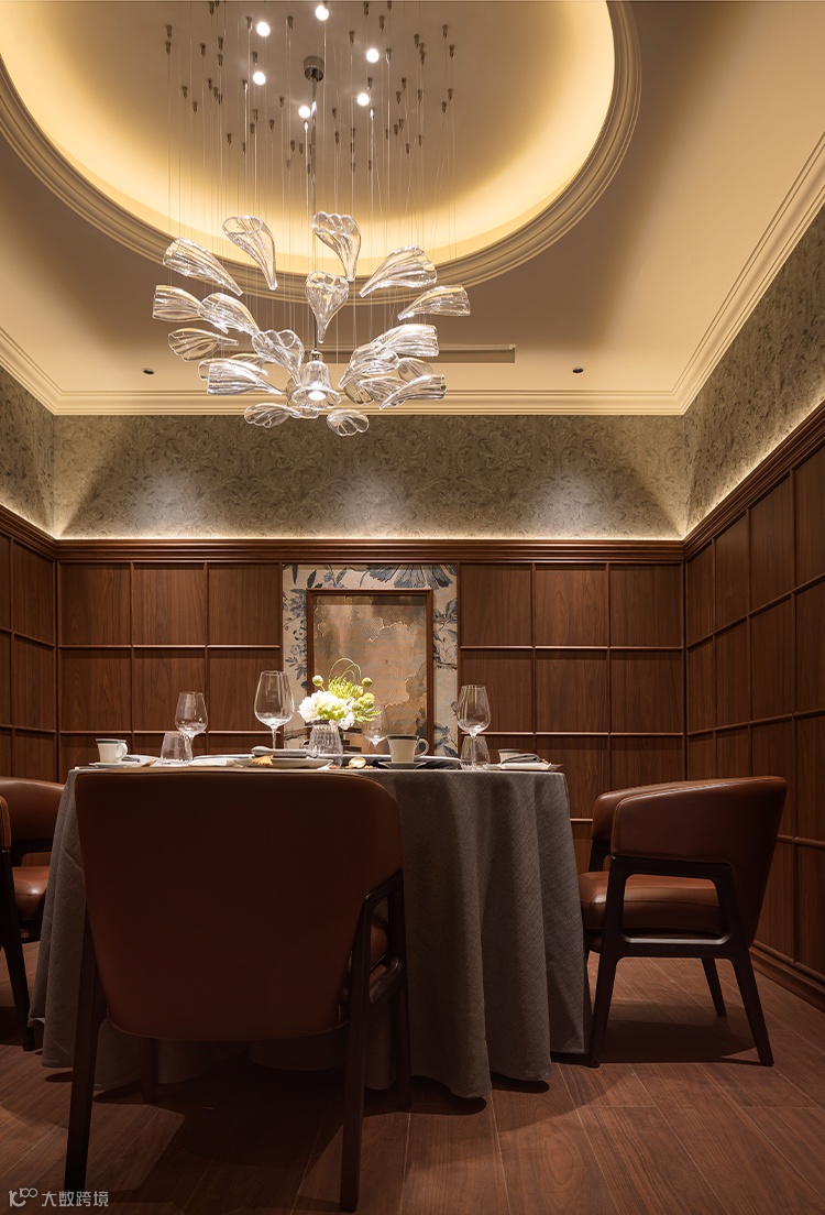 无需繁复的装饰语法,「乌干柚木」自成空间定音鼓。那些被现代工艺复制的天然沟壑,此刻成为空间最诚实的修辞。当视线掠过柚木墙面,仿佛能触碰到树木与季风博弈的百年档案。