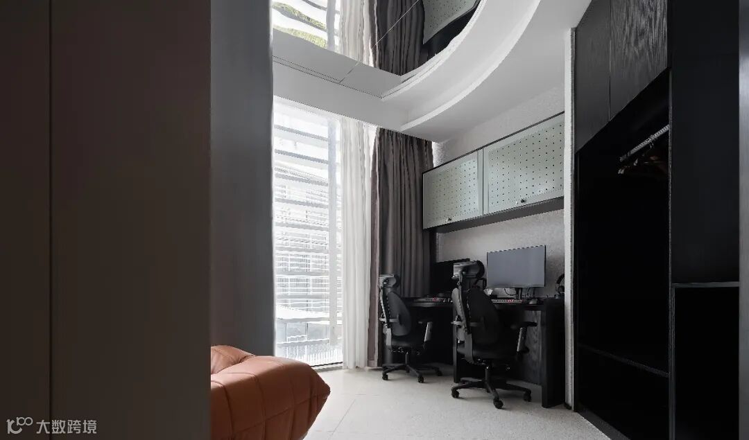 背景墙分隔休息区与电竞区,让人更好地沉浸在休息或游戏的氛围中。