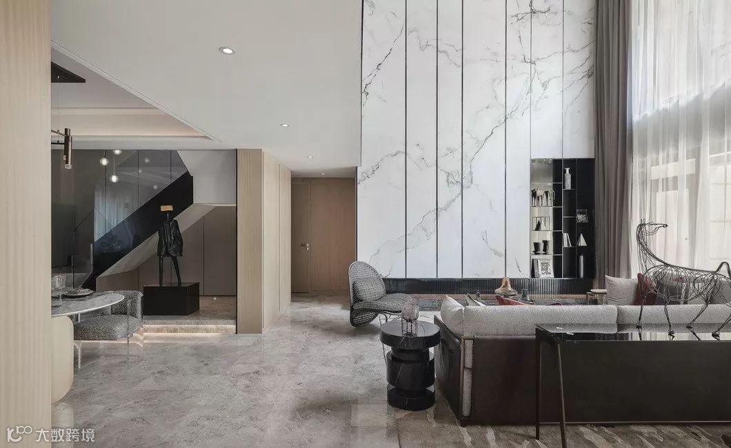 入户后通过通透玻璃的处理方式使书房及客厅浑然一体,挑高的客厅设计在视觉上最大化客厅的面宽。客厅主景以白色石材作像素化的切割处理进行图案的拼贴,结合右侧深色的金属层架,使空间灵动,极具视觉冲击。