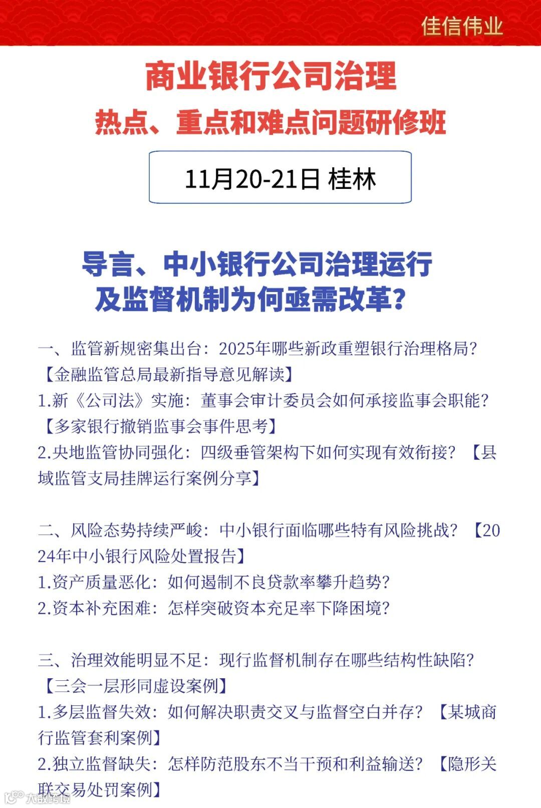 11月20-21日·桂林市·银行最新政策、公司治理、监事会撤销、审计委员会、董事履职、董事会运行实务专题 佳信金融资讯