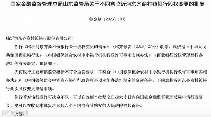 据国家金融监督管理总局网站消息,临沂河东齐商村镇银行主发起行齐商银行的主要审慎监管指标不符合监管要求,不符合《中国银保监会农村中小银行机构行政许可事项实施办法》和《中国银保监会中资商业银行行政许可事项实施办法》规定的资质条件,国家金融监督管理总局山东监管局不同意临沂河东齐商村镇银行股权变更申请事项。