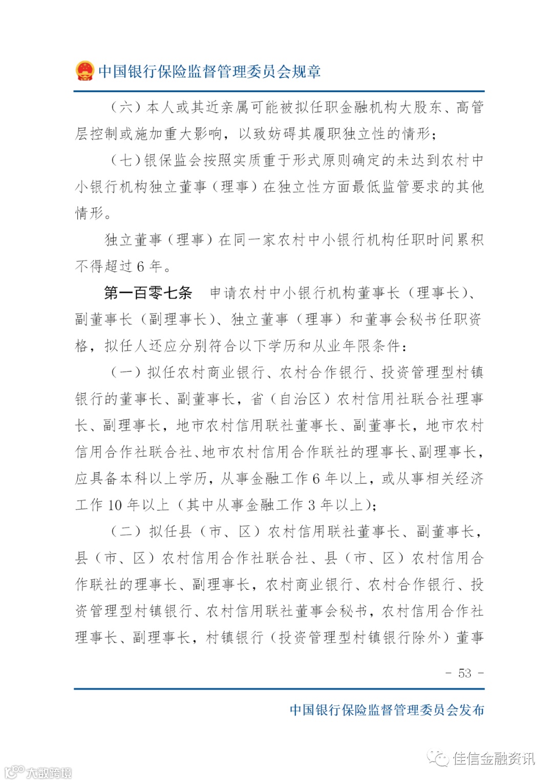 第一百零一条第三款修改为:“农村商业银行、农村合作银行、村镇银行内审部门负责人、财务部门负责人、合规部门负责人、营业部负责人、支行行长,省(自治区)农村信用社联合社合规部门负责人,县(市、区)农村信用合作社联合社、农村信用合作联社、农村信用联社营业部负责人和信用社主任,地市农村信用合作联社、农村信用联社营业部负责人和信用社主任、副主任,农村商业银行分行营业部负责人应符合拟任人任职资格条件。”