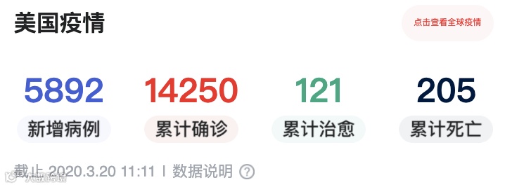 截至3月20日,全美确诊人数已经达到14250例,累计死亡205例。