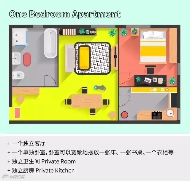 One Bedroom Apartment房型即一室一厅公寓,可以理解为国内的单身公寓,有独立的客厅、卧室、卫生间和厨房,面积通常在30㎡以上。