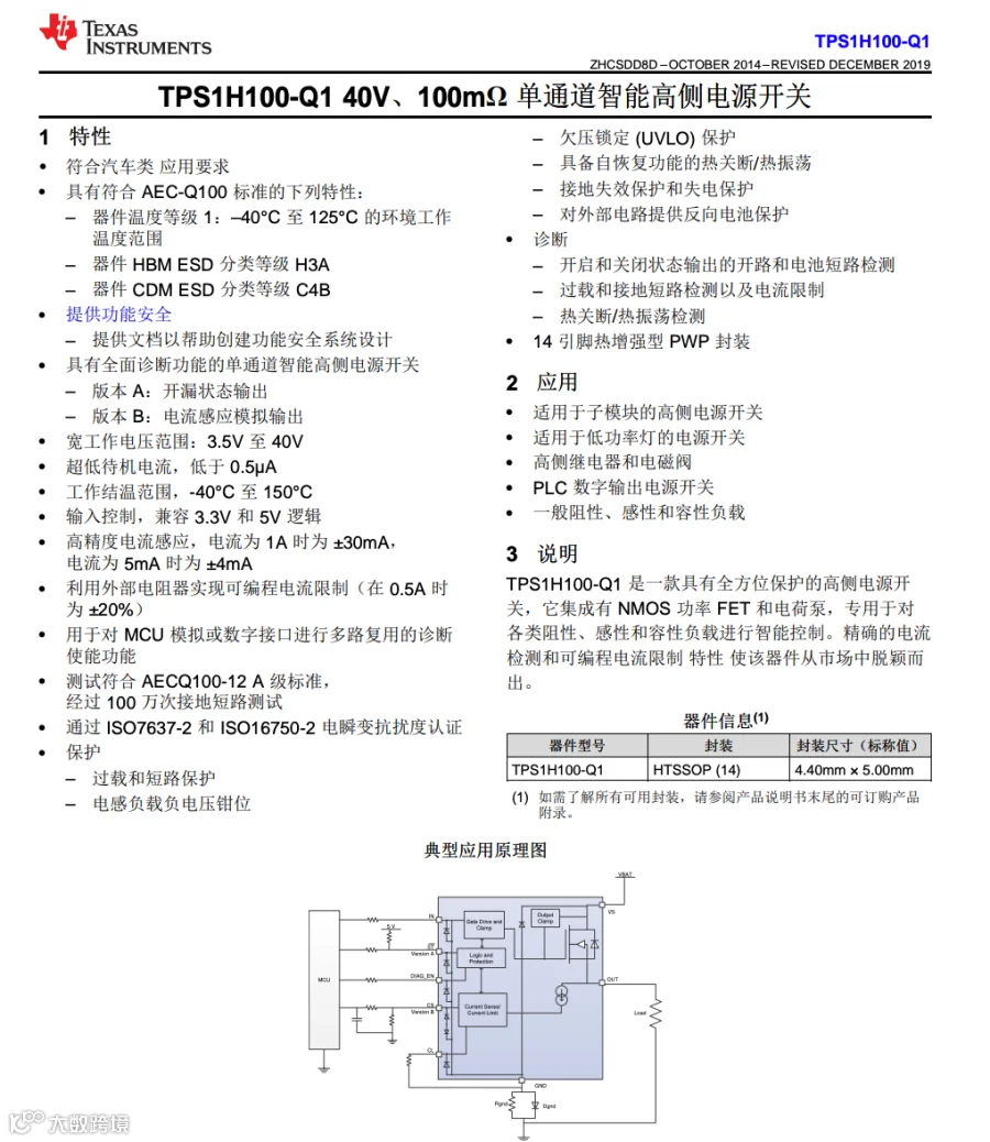 TPS1H100AQPWPRQ1:德州仪器的具有可调节电流限制的40V、100mΩ、汽车类单通道智能高侧开关。输入电压范围3.5V至40V,兼容汽车12V/24V系统,输出电流持续4A、峰值13A,导通电阻80mΩ,具有高精度电流检测和诊断能力,可用于控制中控屏幕四个外设接口的9V电源开关,实现对外部设备的电源管理和保护。