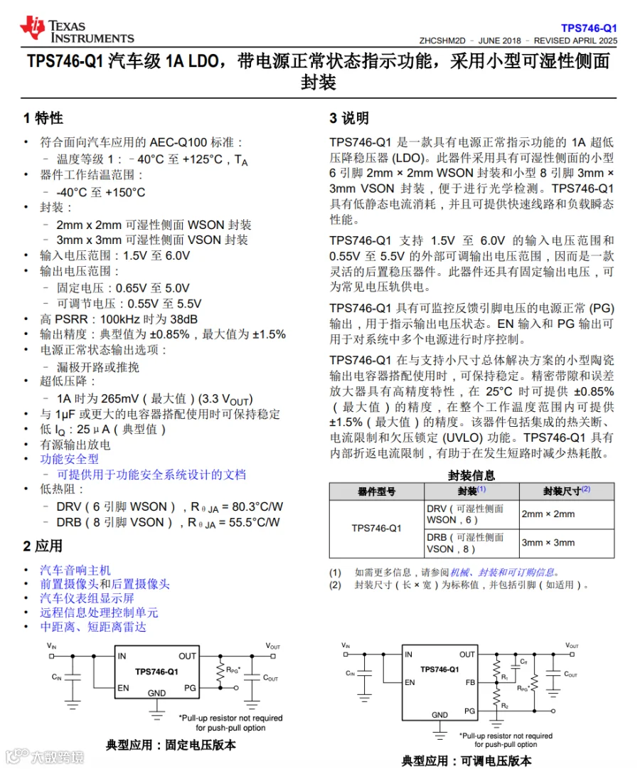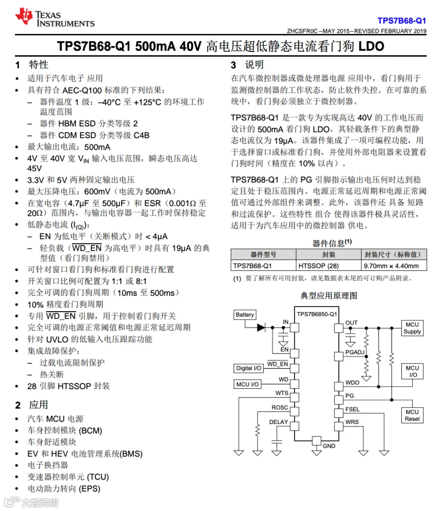TPS74601PQWDRBRQ1:德州仪器的一款具有电源正常指示功能的汽车类、1A、低IQ、高PSRR、低压降(LDO) 稳压器。主要用于为中控屏幕的特定电路提供稳定的低压输出,具有低静态电流、快速瞬态响应等特点,可确保在汽车电源电压波动时,相关电路仍能获得稳定的供电,保证中控屏幕的正常运行。