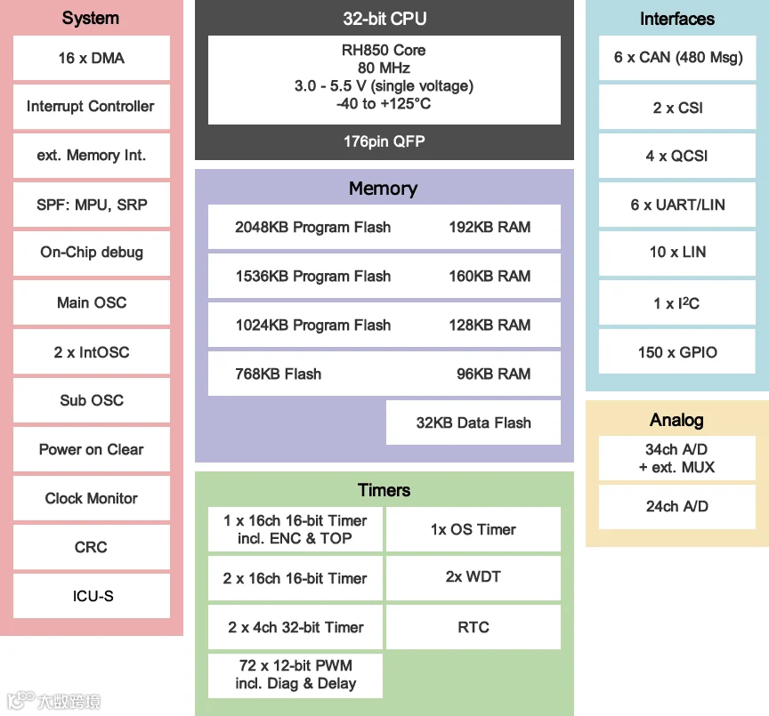中控屏搭载两颗MCU(瑞萨 R7F7010233AFP、恩智浦FS32K144HFT0VLLT),两颗不同供应商的异构MCU或为满足ASIL-D级功能安全,避免共因失效,推测其功能包括屏初始化、故障监控、扩展接口控制等,可能运行AutoSAR系统,因此选用大内存、大Flash 型号。
