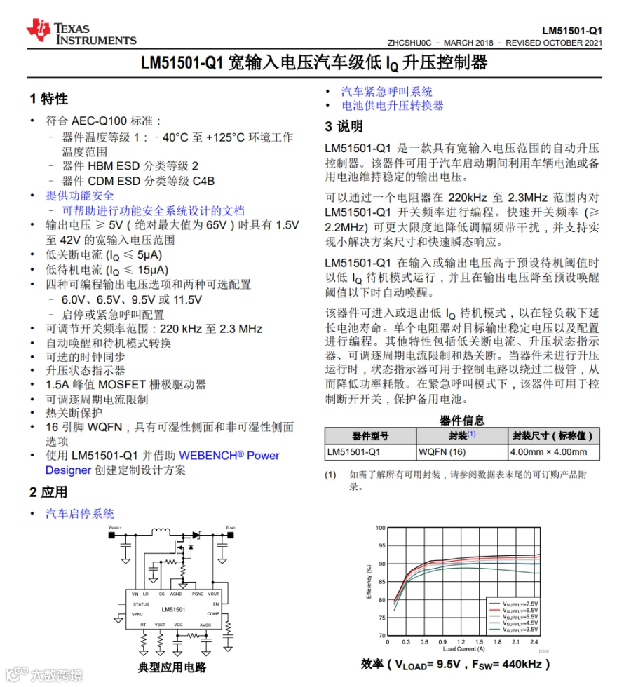 LM51501QRUMRQ1:德州仪器的一款低IQ升压控制器。宽输入范围为1.5V至42V,开关频率可通过电阻器在220kHz至2.3MHz范围内调整,在输入或输出电压超过预设待机阈值时,进入低IQ待机模式运行,当输出电压低于预设唤醒阈值时自动唤醒,可在汽车由蓄电池或备用电池启动时保持稳定的输出电压,为中控屏幕的部分电路提供稳定的升压电源。
