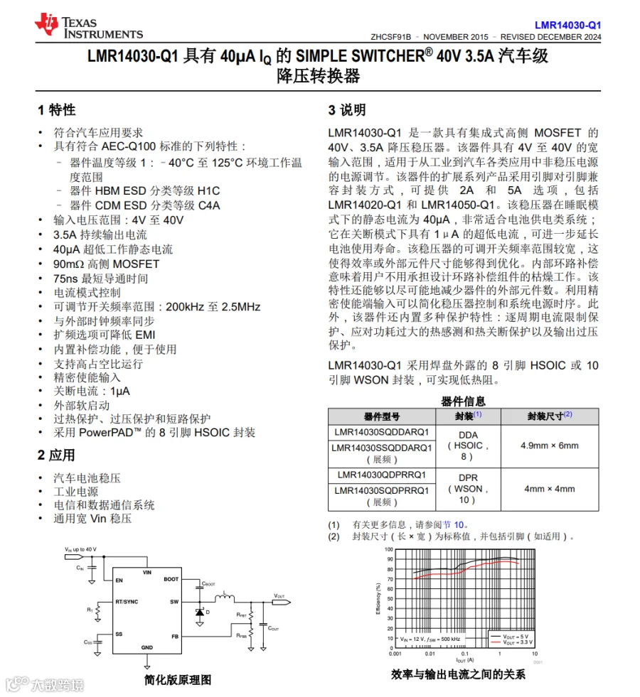 LMR14030SQDDARQ1:德州仪器的一款具有40uAIQ的SIMPLE SWITCHER®、汽车类40V、3.5A2.2MHz降压转换器。其输入电压范围为4V至40V,输出电压范围为0.8V至28V,可通过外部电阻灵活配置,输出电流持续3.5A、峰值6.6A。开关频率固定为2.2MHz,高频开关可减小电感尺寸,同时降低输出纹波,适用于为中控屏幕的不同电路模块提供稳定的电源供应,如主控芯片、显示屏驱动电路等。