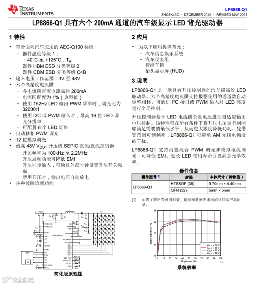 LP8866QRHBRQ1:这是德州仪器的一款汽车显示LED背光驱动器。它具有6个高精度电流阱,每个电流阱直流电流高达200mA,电流匹配度为1%。支持通过I²C接口或PWM输入对LED亮度进行全局控制,调光比最高可达32000:1。其输入电压工作范围为3V至48V,开关频率最高可达2200kHz,还具备多种故障诊断功能,如LED开路检测、LED短路到地检测等,符合AEC-Q100汽车应用标准。