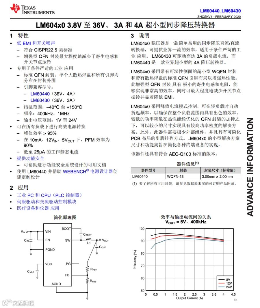LM60440:德州仪器一款用于电源管理的芯片,采用增强型EMI QFN封装、具有可湿性侧面和外部焊盘的36V、4A同步转换器。