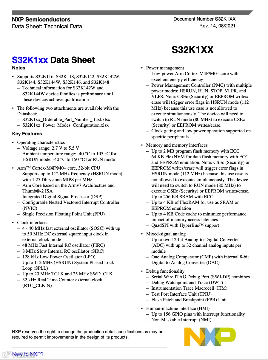 FS32K144HFT0VLLT:恩智浦的一款高性能汽车通用MCU,S32K144 32-bit MCU, ARM Cortex-M4F, 512kB Flash, 80MHz, CAN-FD, FlexIO, 105℃, LQFP 100。