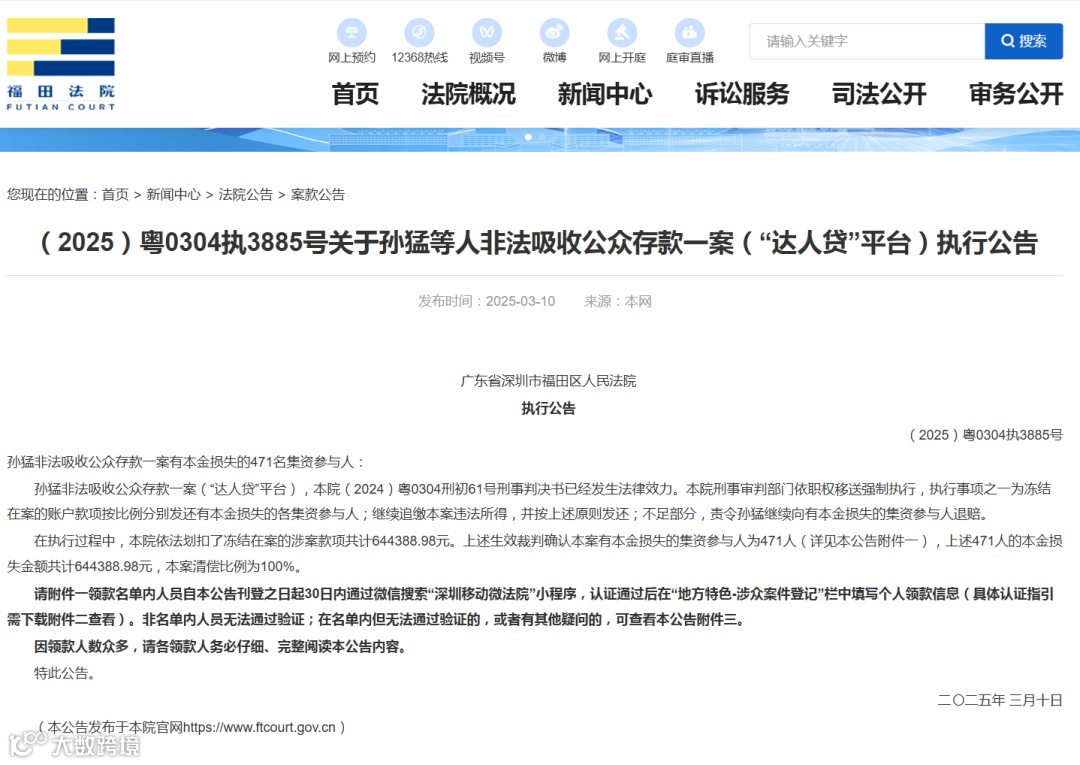 日前,深圳市福田区人民法院官网发布公告,孙猛非法吸收公众存款一案(“达人贷”平台)将进行返款,在案的账户款项按比例分别发还有本金损失的各集资参与人,471人的本金损失金额共计644388.98元,本案清偿比例为100%。