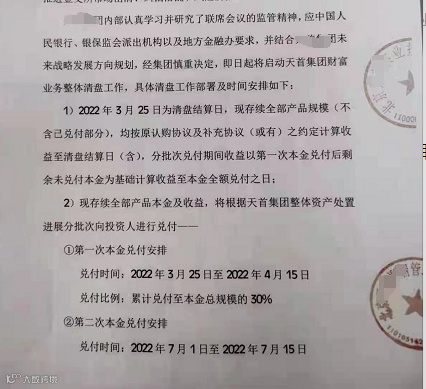 2022年1月,xx资本屡次爽约之后,公布一则现金清退方案。第一次兑付时间2022年3月25日至2022年4月15日,兑付比例为本金30%,第二次兑付为2022年7月1日至7月15日,兑付至本金40%,第三次兑付时间为2022年8月1日至8月15日,兑付至本金50%,第四次兑付时间为2022年9月1日至9月30日,完成本金100%兑付,收益兑付时间是2022年10月1日至2023年3月31日。