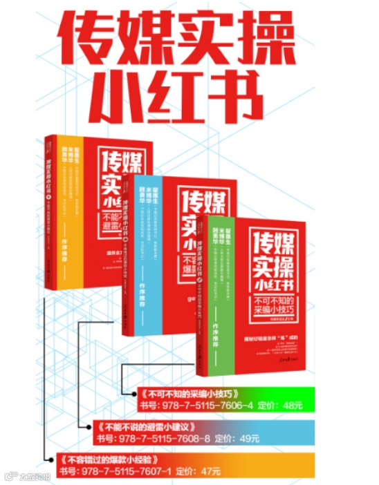 “传媒实操小红书”是由传媒茶话会主编,人民日报出版社出版的新闻实操系列图书,既包含重大纪念日报道防错指南、两会报道注意事项、常见字词标点差错解析等新闻宣传工作者必须掌握的避雷建议;又有历届中国新闻奖获奖作品点评、好稿是怎样“修炼”成的等不可不知的采编技巧;还有10万+选题长什么样、如何打造新媒体爆款等不容错过的爆款经验。