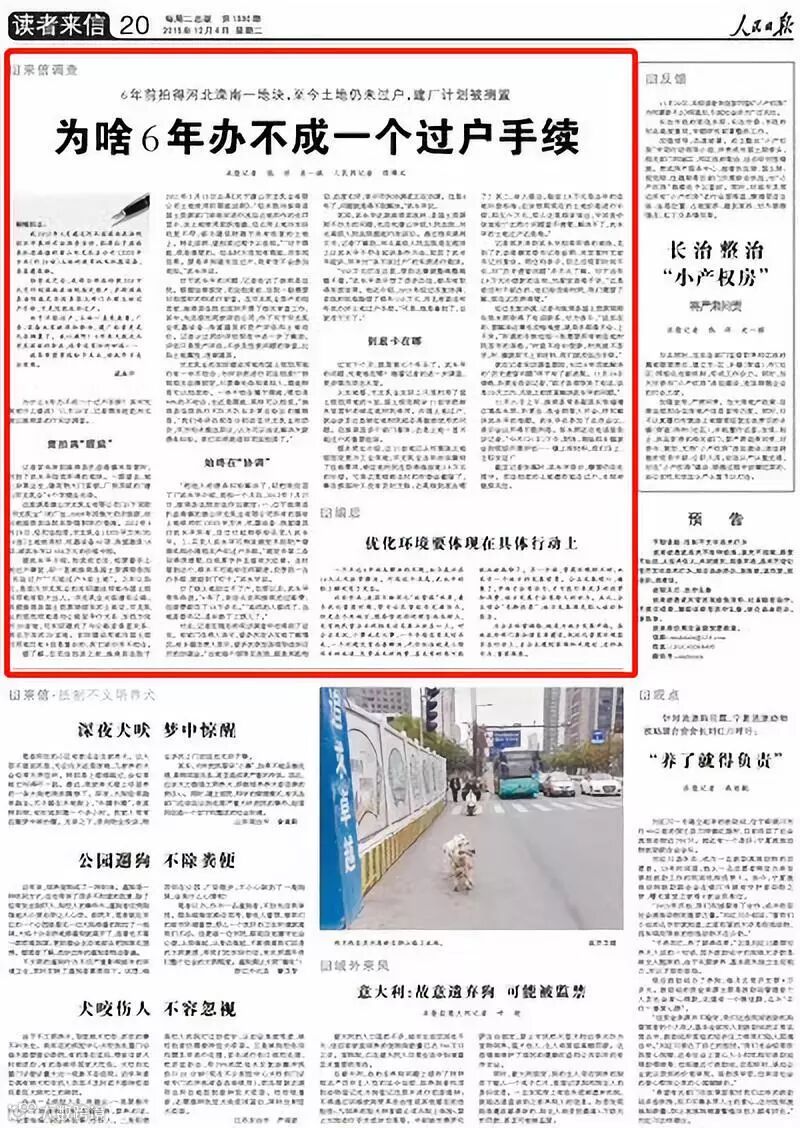 2018年12月4日,《来信调查》栏目推出调查报道《为啥6年办不成一个过户手续》,文章配发的“编后”启示地方政府部门在解难题时,要依法、谋长远,避免“按下葫芦浮起瓢”。