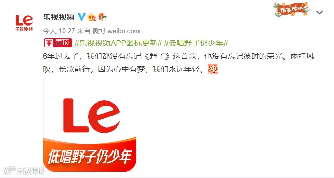 据快科技,6月17日,乐视视频宣布更新APP图标,底部加了7个字:“低唱野子仍少年”官方文案写到:“6年过去了,我们都没有忘记《野子》这首歌,也没有忘记彼时的荣光。雨打风吹,长歌前行。因为心中有梦,我们永远年轻。”《野子》是贾跃亭最喜欢的歌曲之一,在2016年乐视年会上,贾跃亭就曾献唱《野子》,但唱完不久,乐视资金链断裂。